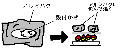 殻付かきをアルミハクに包んで、オーブン、または焼き網で焼く。